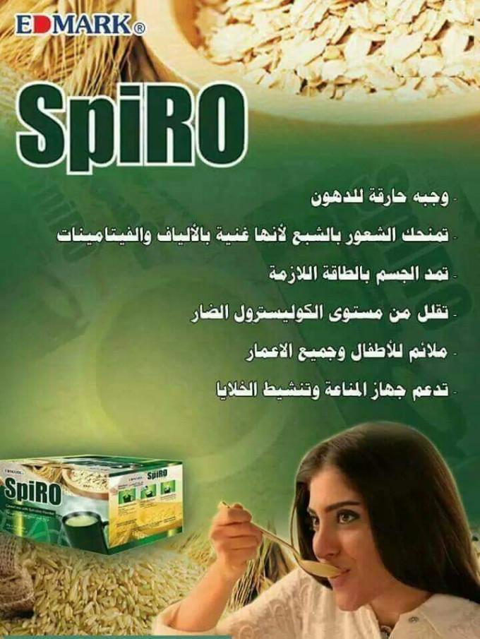 شوربة سبيرو : هي مزيج من الحبوب الغذائية الممزوجة بسبيرولينا تحتوي على العناصر الغذائية المتكاملة من نخالة الشوفان ونخالة الأرز والبتروتين الغني بسبيرولينا وتعتبر مكمل غذائي مفيد للصغار والكبار.